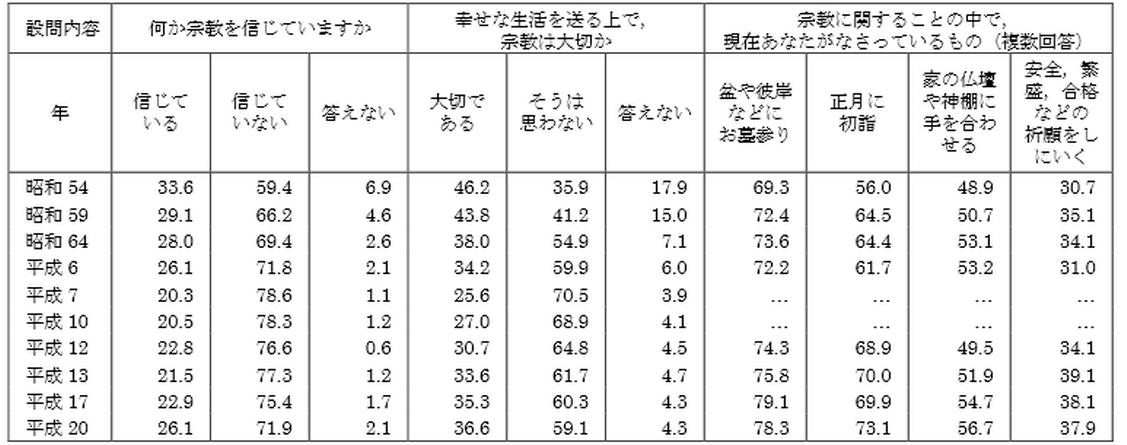Ein deutlicher Einbruch bei den positiven Antworten auf die beiden ersten Fragen zeigt sich in den Jahren 1995 und 1998. Das hängt zusammen mit den Terroranschlägen der Aum-Sekte 1995. Danach steigen die Prozentzahlen wieder, wenn auch nicht mehr auf das vorherige Niveau. Bei den mit der Religion zusammenhängenden Tätigkeiten zeigt sich allerdings eine ansteigende Tendenz.