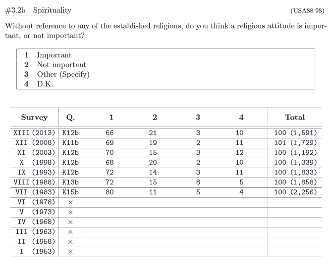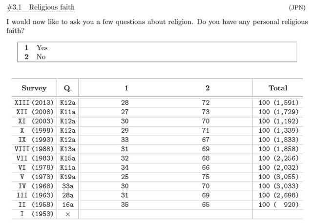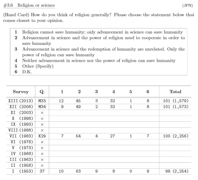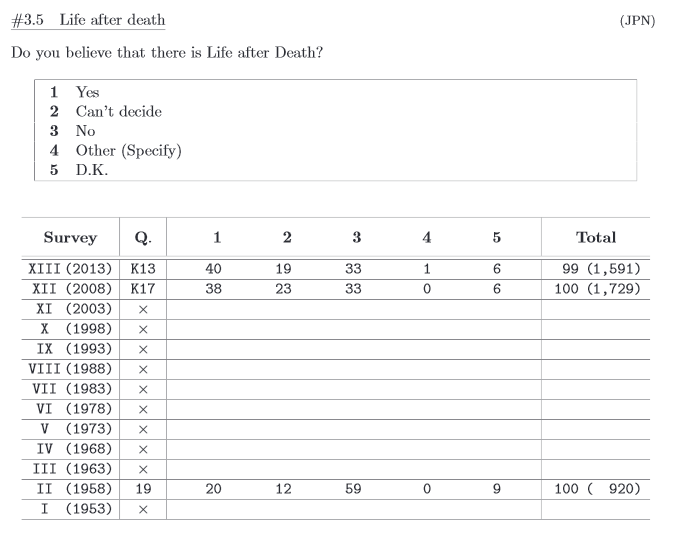 Die Tabellen dort sind interaktiv und erlauben es, die Ergebnisse in zahlreiche Kategorien aufzuteilen: Männer/Frauen, Altersgruppe, Größe des Wohnorts, Region, Schulbildung. Wenn man ein bestimmtes Jahr wählt, ist das Ergebnis auch nach Männern/Frauen und Altersgruppen spezifiziert. Ohne wenigstens rudimentäre Japanischkenntnisse dürfte die Benutzung allerdings schwierig sein.