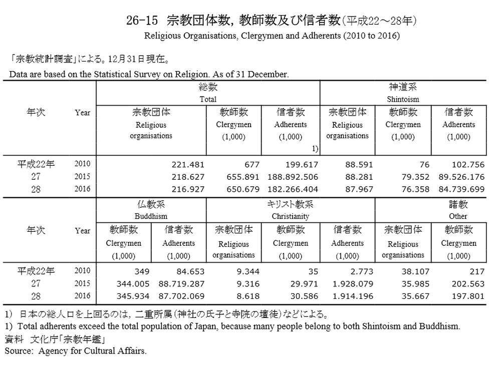 Wie seit Jahrzehnten veröffentlicht die Agency for Cultural Affairs weiterhin jährlich eine zweisprachige Zusammenfassung ihrer Erhebungen zur Religion in Japan, obwohl deren Problematik seit langem bekannt ist.