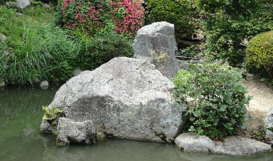 Das gilt auch für zahllose kleine Steine in ähnlicher Form, die man überall in Japan vor allem an Wegrändern und in Schreinen findet, wie auf dem zweiten Bild. Wie dort werden beide Steine oft eng aneinander gestellt. Auf dem dritten Bild haben die Steine in einem Tempel die gleichen Formen, nur imposanter durch ihre Größe, aber das Fehlen von Shimenawa und gefalteten Papierstreifen zeigt, dass sie ihren göttlichen Zauber verloren haben und dass nun der ästhetische Reiz und das künstlerische Arrangement im Vordergrund stehen. Das wird noch deutlicher an dem nächsten Beispiel am gleichen Ort. Aus der Form der Steine ist ersichtlich, dass es sich ursprünglich um typische Inyōseki handelt, aber in der Erklärung des Tempels geht es um eine Schildkröte und einen Kranich, wobei besonders die letztere Zuordnung verwundert.