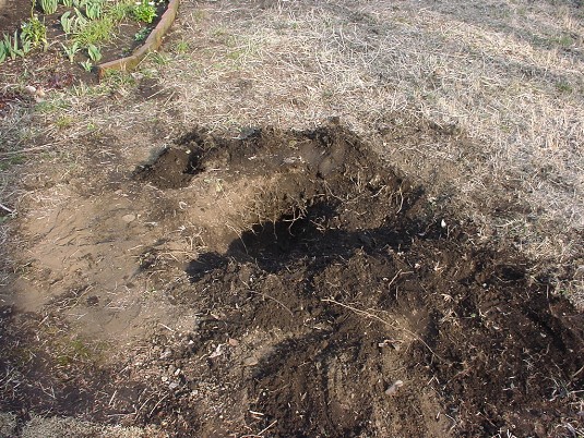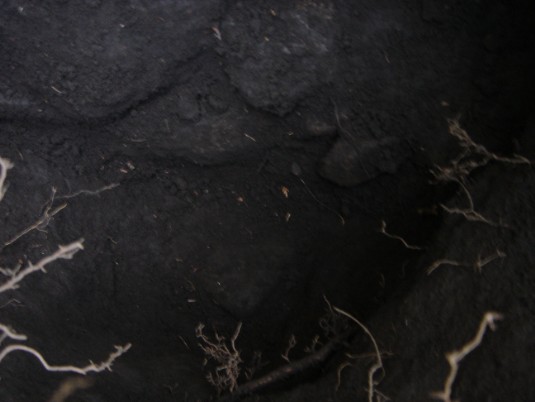 Als ich den Baum wieder einpflanzen und dabei das Loch noch etwas größer und tiefer machen wollte, stieß ich mit dem Spaten auf einen Stein. Ich stoppte mit dem Graben und versuchte sicherheitshalber mit den Händen im Boden vorsichtig herauszufinden, wie groß der Stein war. Zu meinem Erstaunen kam ein etwa 30 x 20 cm großer Stein zum Vorschein. Da er nur circa 20 cm unter der Oberfläche lag (siehe die Fundstelle links),