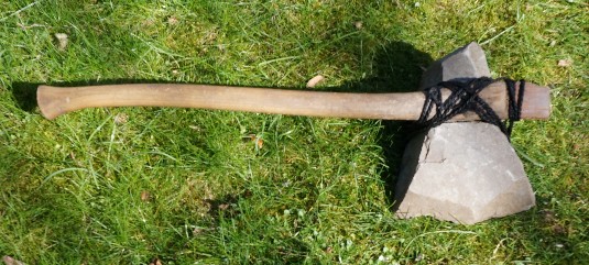 das Material nicht ungewöhnlich war und auch wegen seiner Größe verwarf ich die kurz in meiner Phantasie auftauchende Möglichkeit einer Verbindung zur Steinzeit und wollte den Stein schon entsorgen. Da fiel mir seine ungewöhnliche Gestalt auf. Er sah tatsächlich aus wie eine große Steinaxt. Besonders auffällig die gerade Kante, die geradezu optimal geignet ist, um auch mit einfachen Mitteln einen Stiel zu befestigen.