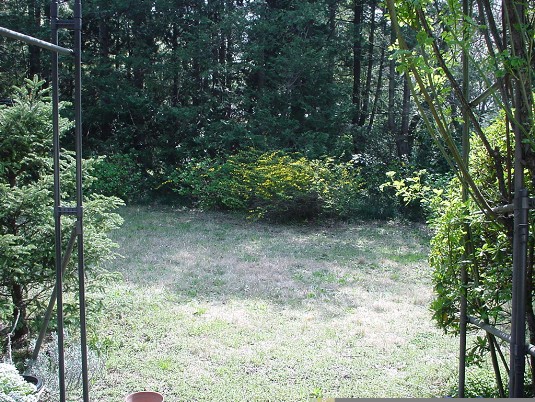 Das Bild links zeigt den Blick von unserer Terrasse in das Gelände hinter dem Haus. Den Versuch, dort so etwas wie einen Garten anzulegen, hatten wir wegen der üppigen Vegetation, der Mücken und der kaum erträglichen Hitze im Sommer bald aufgegeben. Dafür gelang es uns, unseren Weihnachtsbaum über Jahre im Garten am Leben zu halten und immer wieder zu benutzen, bis er zu groß wurde. Auf dem Bild kann man ihn links sehen. Und damit beginnt der Wendepunkt in meiner Geschichte.
